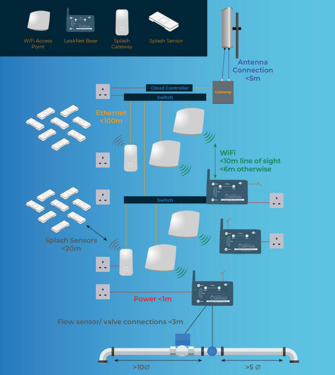 A typical large project topology incorporating 100s LeakNets and SplashSensors may look like this: